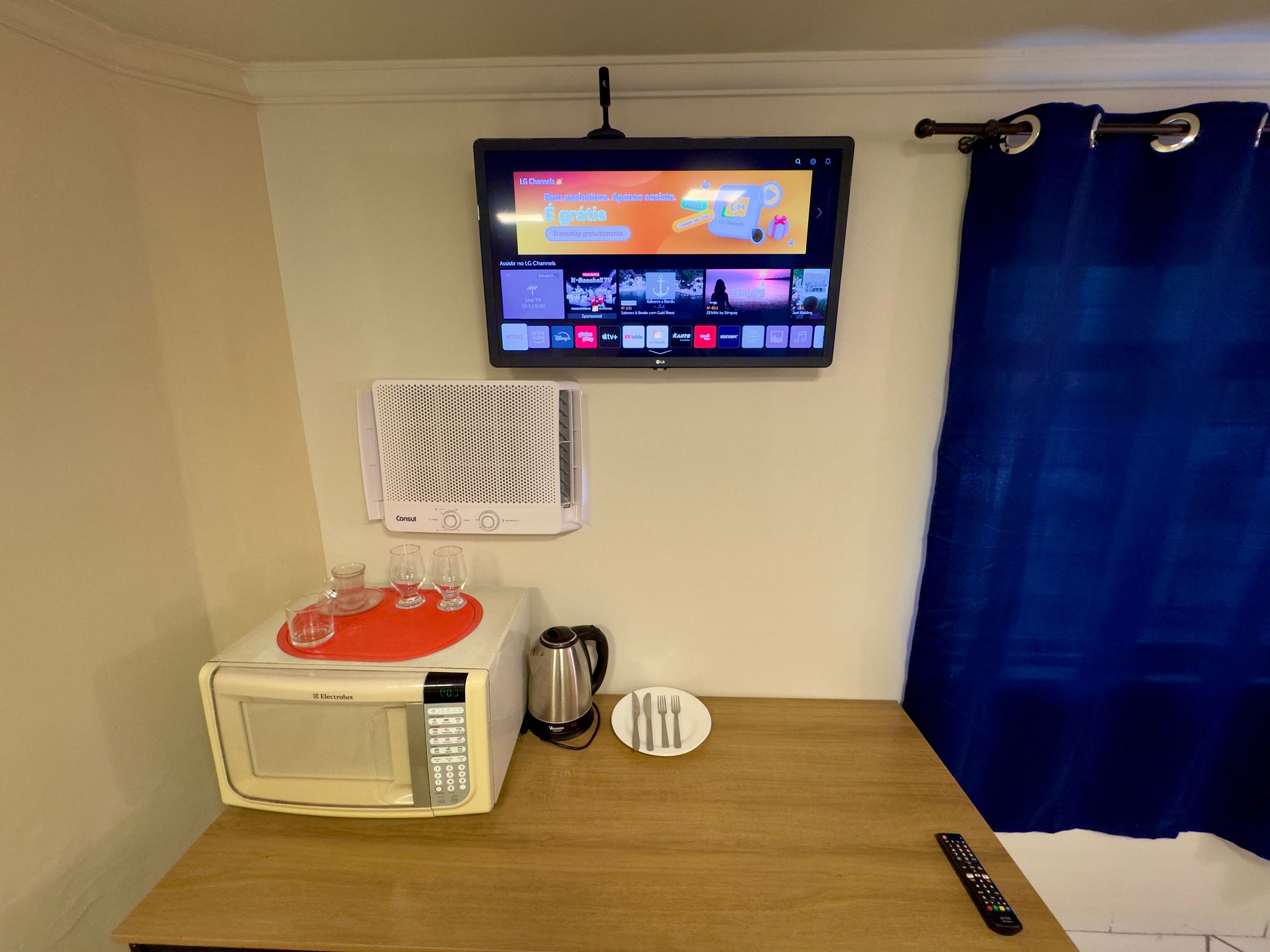Apartamento compacto recém-reformado com ar-condicionado, janela para a rua, cama queen size, TV de 32 polegadas com acesso a Netflix, frigobar, micro-ondas, chaleira elétrica, secador de cabelo, mesa, pratos, talheres, copos e outros utensílios. Vista privilegiada e apenas um lance de escada. Estacionamento coberto opcional e várias vagas seguras e gratuitas disponíveis em frente.