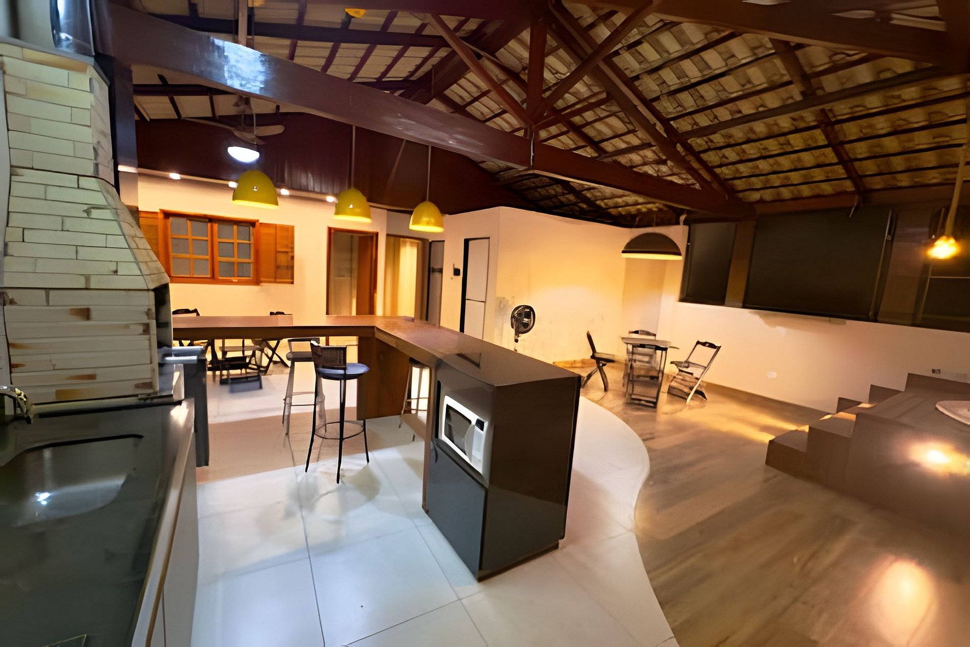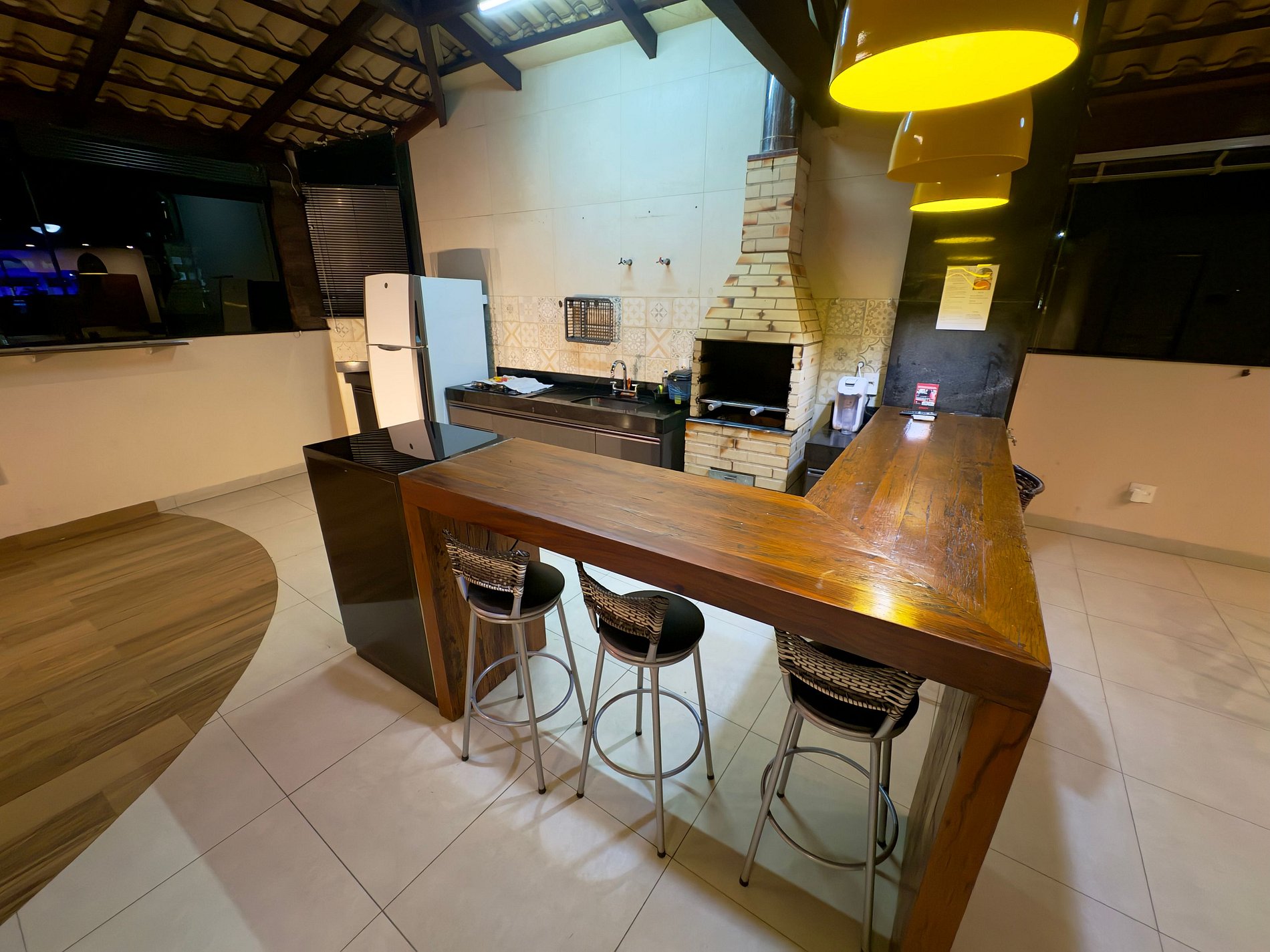 Bancada com 4 banquetas, 2 mesas com cadeiras.