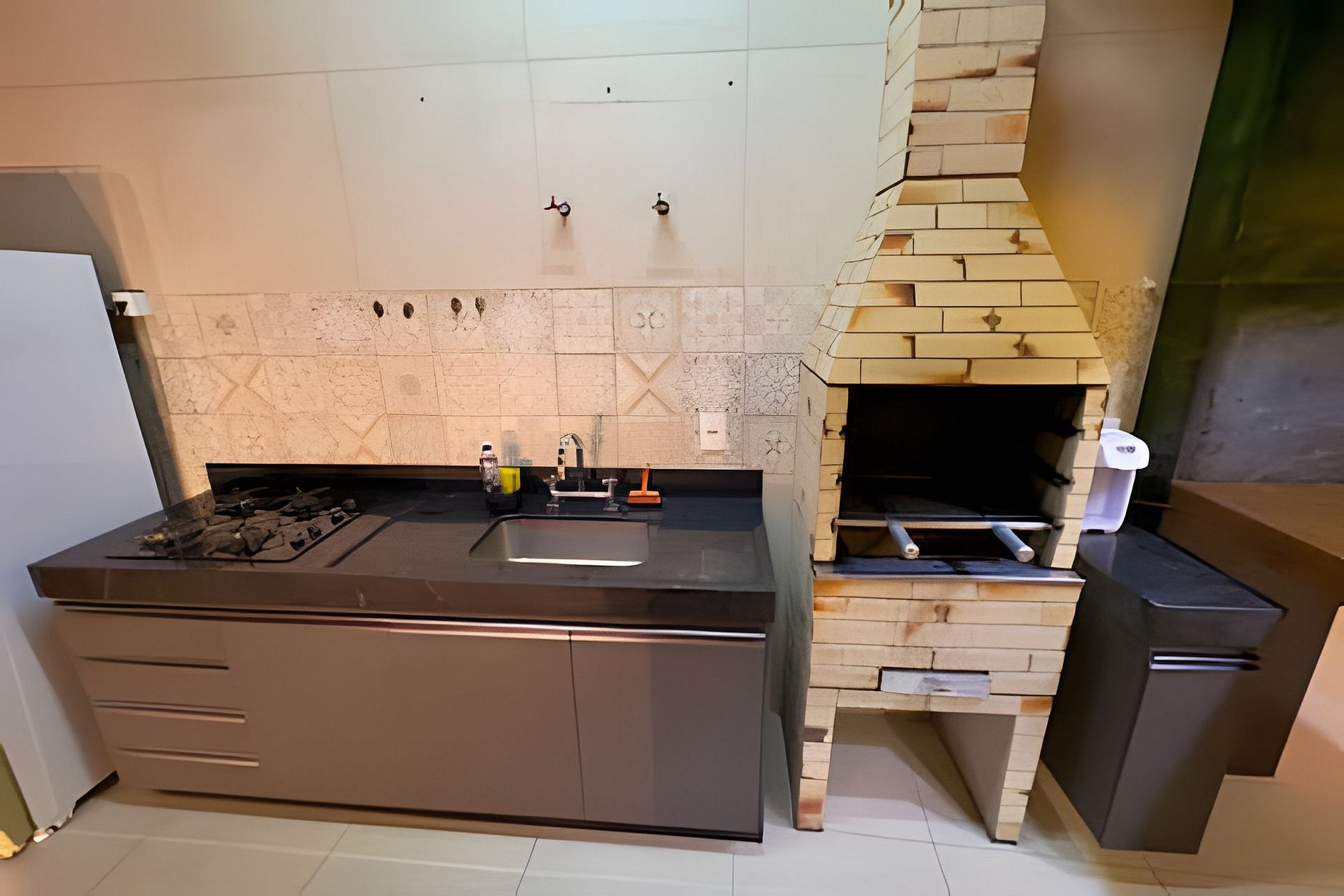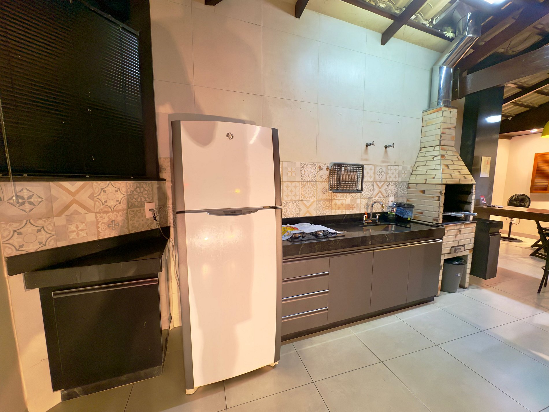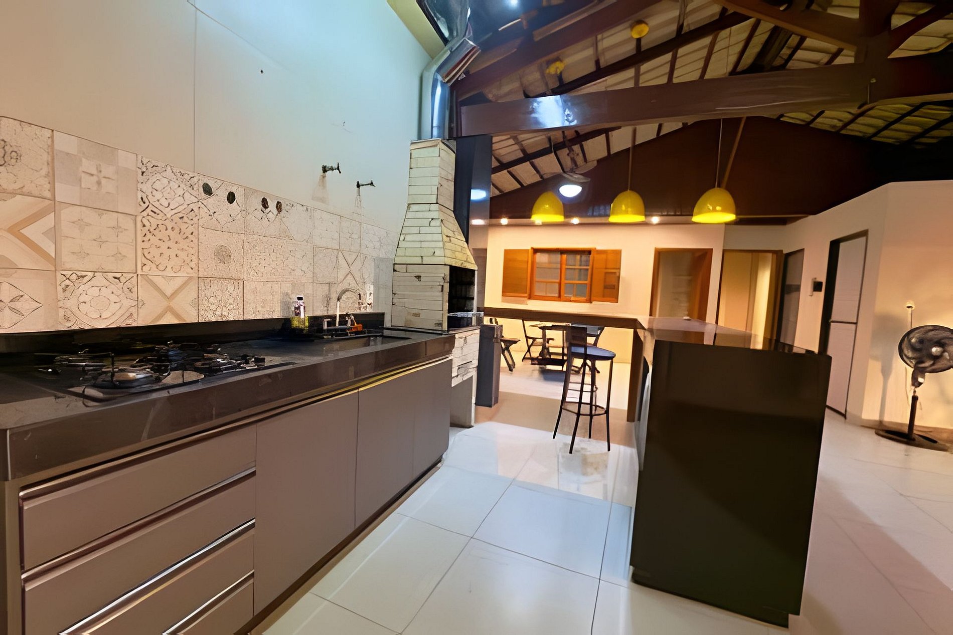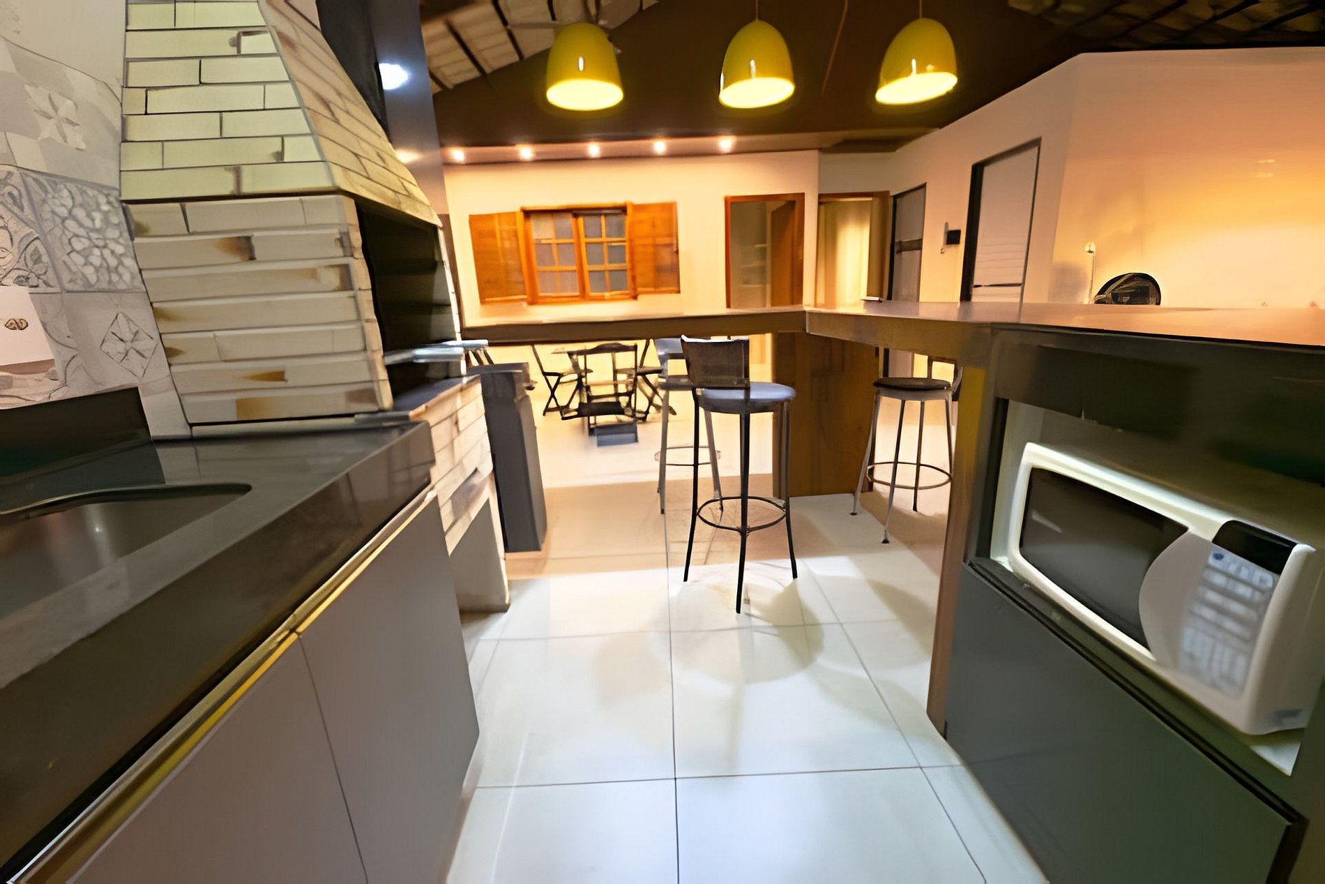 Cozinha com cooktop, microondas, geladeira 410L, churrasqueira.