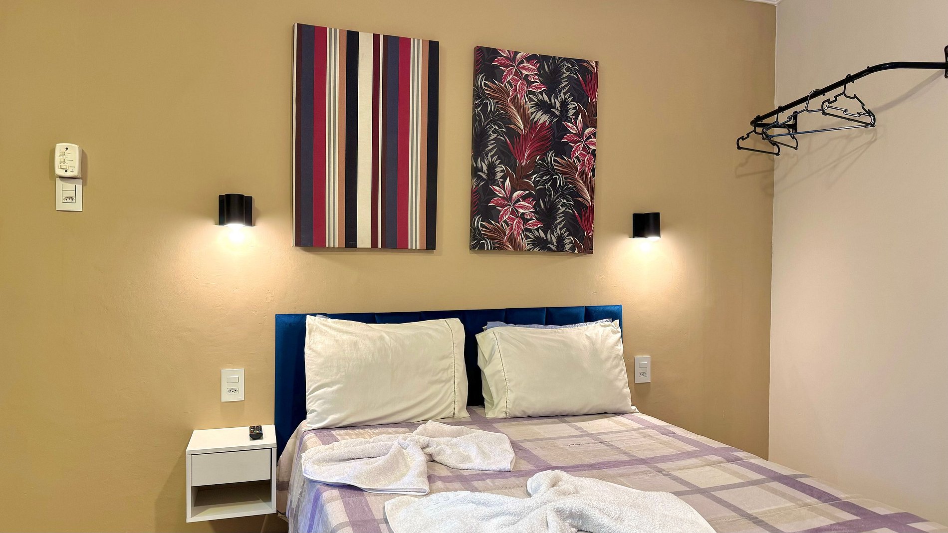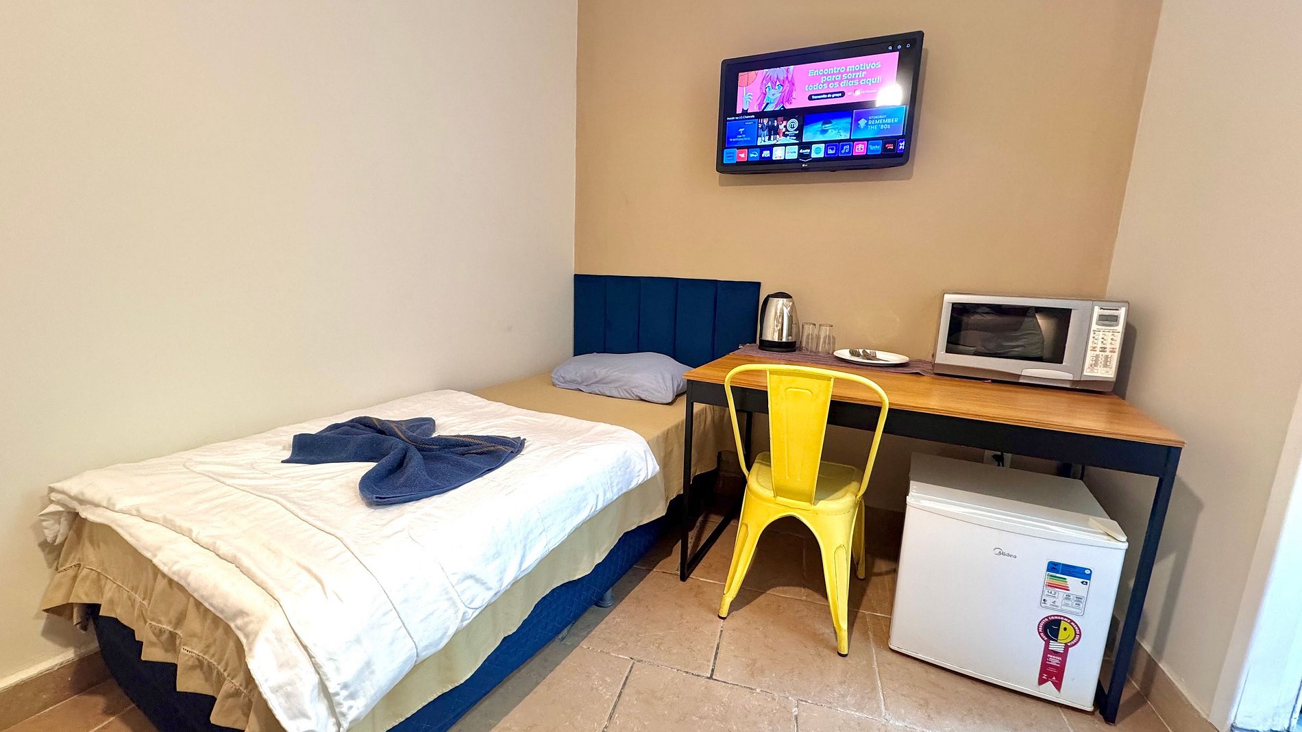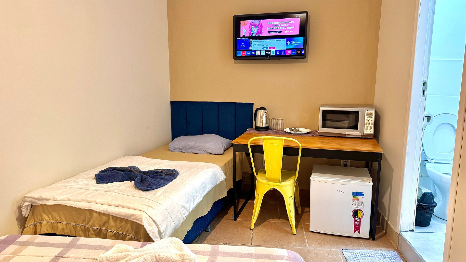Conheça nossa suíte tripla standard no VA Apart Hotel Savassi. O flat oferece 1 cama de casal, 1 de solteiro, Smart TV de 32", frigobar, micro-ondas, chaleira elétrica, secador de cabelo, ventilador de teto, mesa para refeições ou trabalho, banheiro privativo e bela vista para o centro. Acomoda três pessoas, com opção de adicionar colchão extra para mais ocupantes mediante pedido especial.