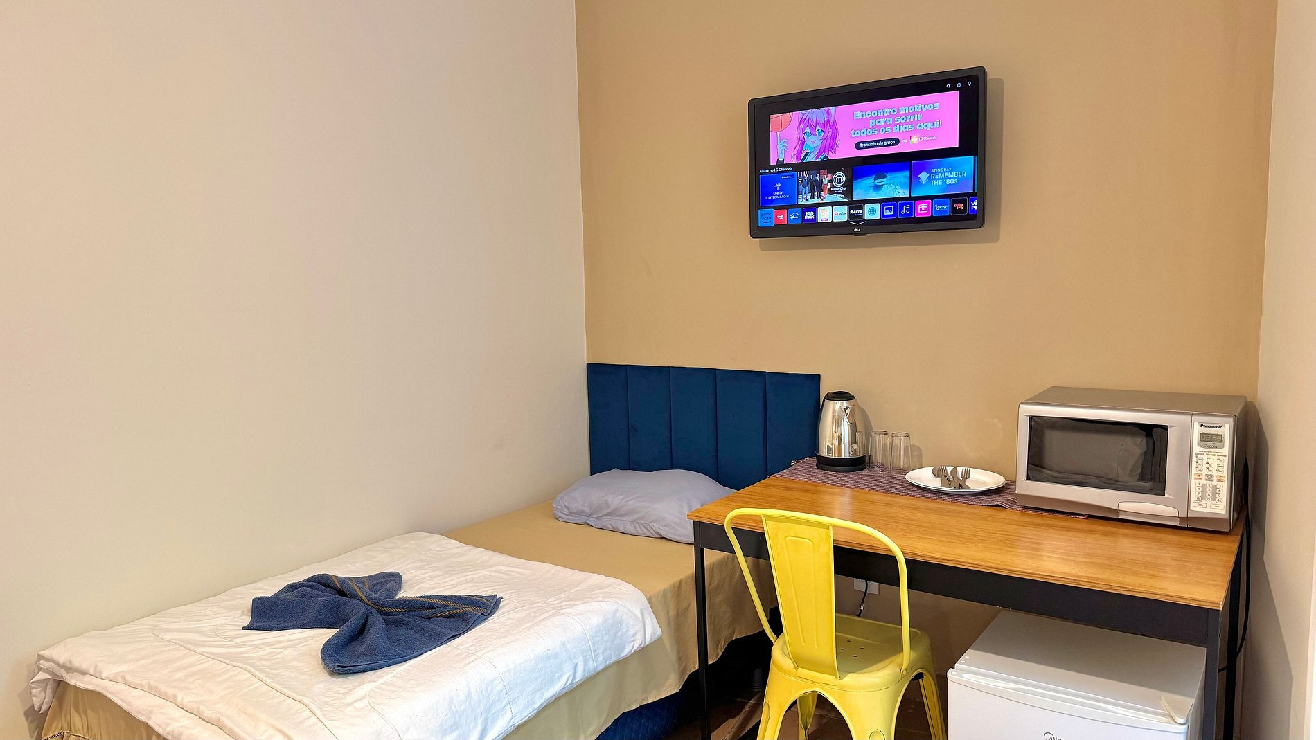 Conheça a suíte tripla standard do VA Apart Hotel Savassi, localizada no segundo andar. Dispõe de 1 cama de casal, 1 de solteiro, Smart TV, frigobar, micro-ondas, chaleira elétrica, secador de cabelo, água filtrada, ventilador de teto, mesa para refeições ou trabalho, banheiro privativo e uma bela vista do centro. Ideal para até 3 pessoas, com opção de colchão extra mediante solicitação.