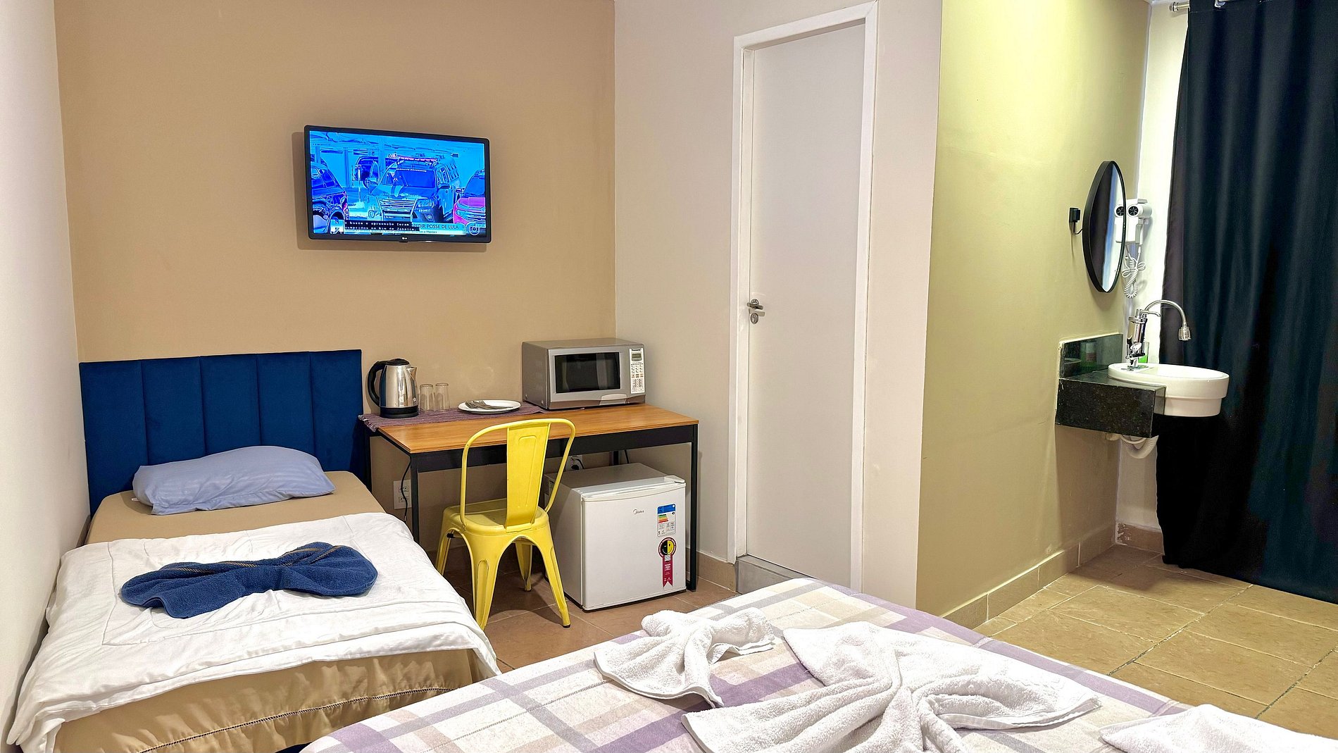 Conheça a suíte tripla standard do VA Apart Hotel Savassi, localizada no segundo andar. Dispõe de 1 cama de casal, 1 de solteiro, Smart TV, frigobar, micro-ondas, chaleira elétrica, secador de cabelo, água filtrada, ventilador de teto, mesa para refeições ou trabalho, banheiro privativo e uma bela vista do centro. Ideal para até 3 pessoas, com opção de colchão extra mediante solicitação.