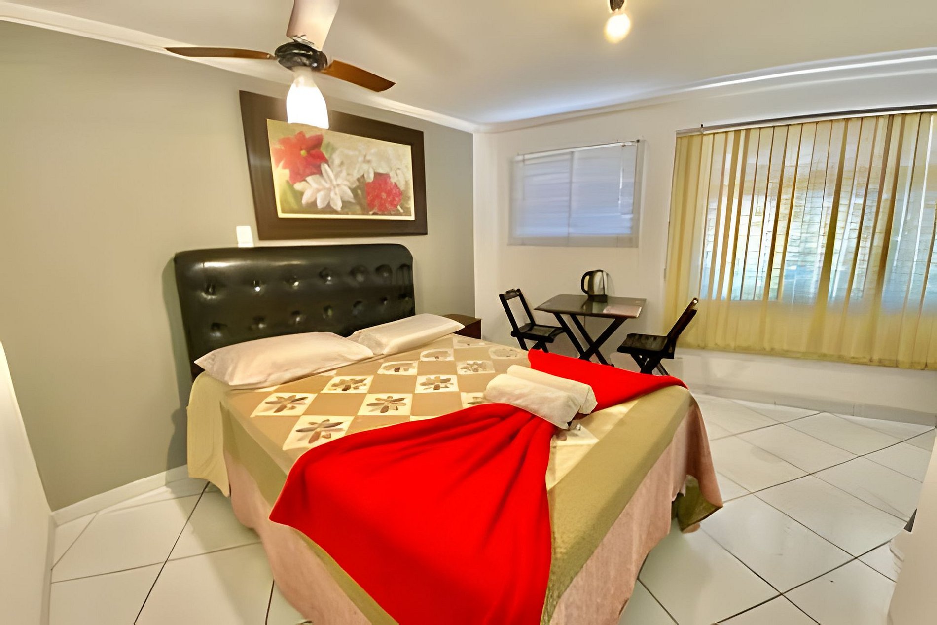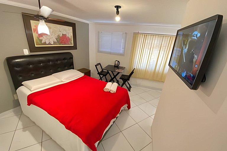 Apartamento compacto recém reformado de. Ar condiconado, janela pra rua, cama de casal queen size, TV 32" com netflix, frigobar, microondas, chaleira elétrica, secador de cabelo, mesa, pratos, talheres, copos etc. Vista privilegiada e somente 1 vão de escada. Estacionamento coberto opcional e temos muitas vagas seguras e gratuitas na porta.